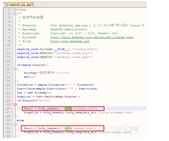 2.通过ftp进入网站,将dede文件下makehtml_map.php中的$cfg_cmspath."/data/sitemap.html";和$cfg_cmspath."/data/rssmap.html";里的/data去掉。