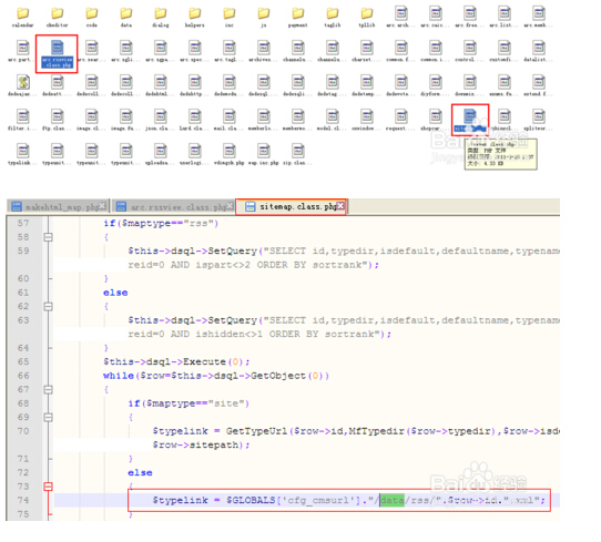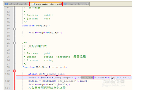 3.然后,再将根目录下include文件中的arc.rssview.class.php里$murl = $GLOBALS['cfg_cmspath']."/data/rss/".$this->TypeID.".xml";的/data去掉。同时,还将sitemap.class.php里的$typelink = $GLOBALS['cfg_cmsurl']."/data/rss/".$row->id.".xml";和$typelink = $GLOBALS['cfg_cmsurl']."/data/rss/".$row->id.".xml";的/data也去掉。